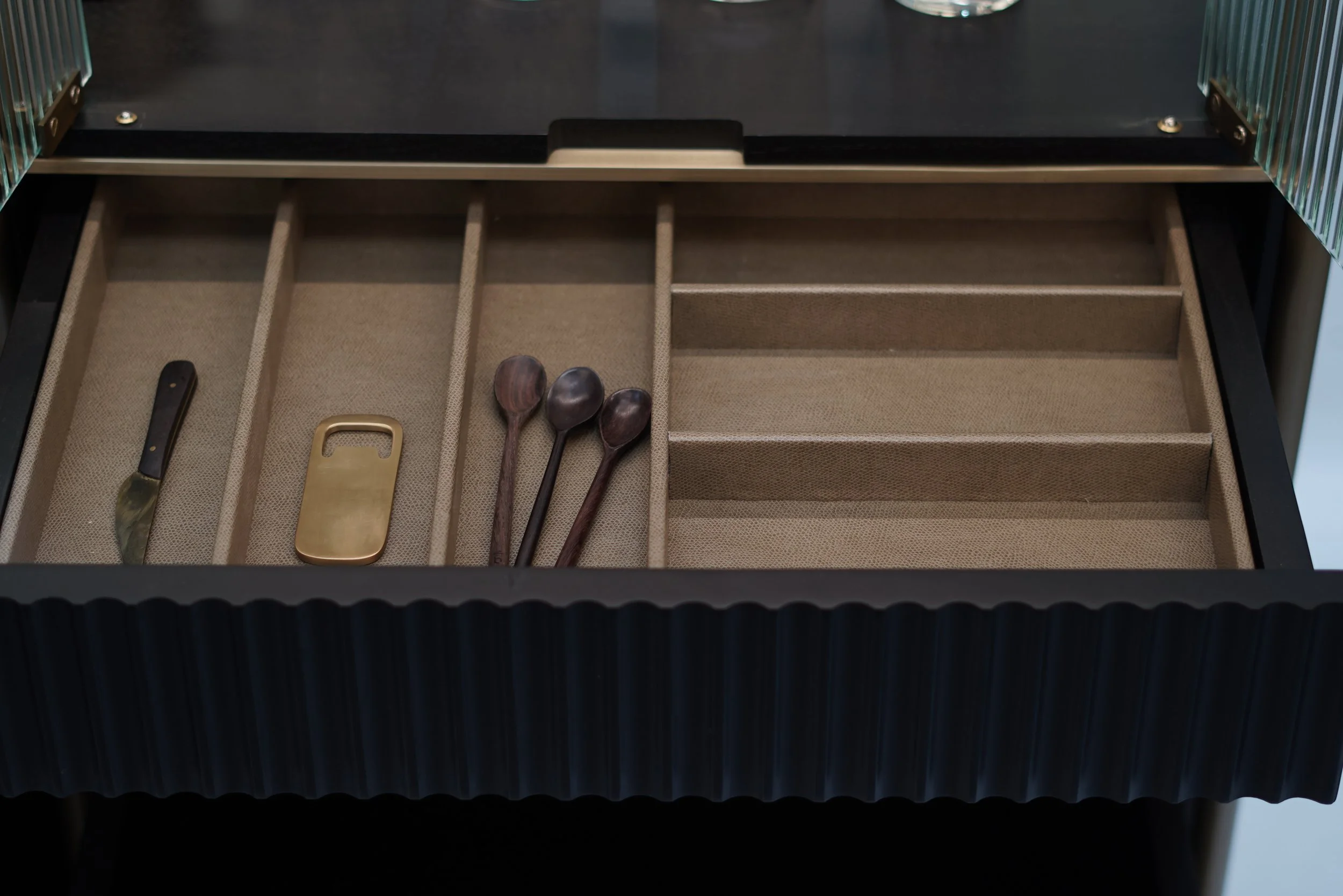 It is a smart blend of display and function. Its sleek design resembles a display case, revealing a fully functional home bar when opened. Switch effortlessly from showcasing to entertaining, adding a touch of practical sophistication to your space.