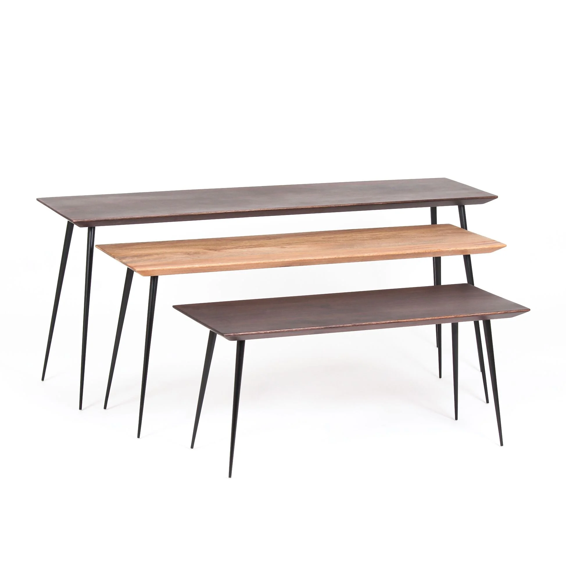 Reminiscent of U-Boats or German submarines, this elegant peg table is similar to how the battleship was built. Crafted in solid cast iron, with machined rods, topped by a patinated wooden top, the table is an ode to the manufacturing prowess that the world achieved in the course of the world wars. A handy sleek table, which slips quietly into any living space, being around when you need it.